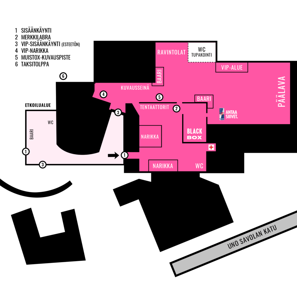 Alue aukeaa klo 19.00, mutta osallistujat voivat saapua paikalle omassa tahdissaan ilman kiirettä. Jonotuksen sujuvoittamiseksi kävijöille suoritetaan turvatarkastus jo etkoilualueelle saavuttaessa, ja Paviljongin ovien auetessa kävijät voivat siirtyä suoraan narikkaan tai tentaattoripisteille.