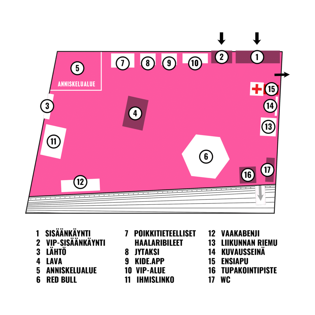 avaa lippu valmiiksi Kide.appista ja ota henkilöllisyystodistus esille. Saat tarkastuspisteeltä rannekkeen ja suorituspassin.